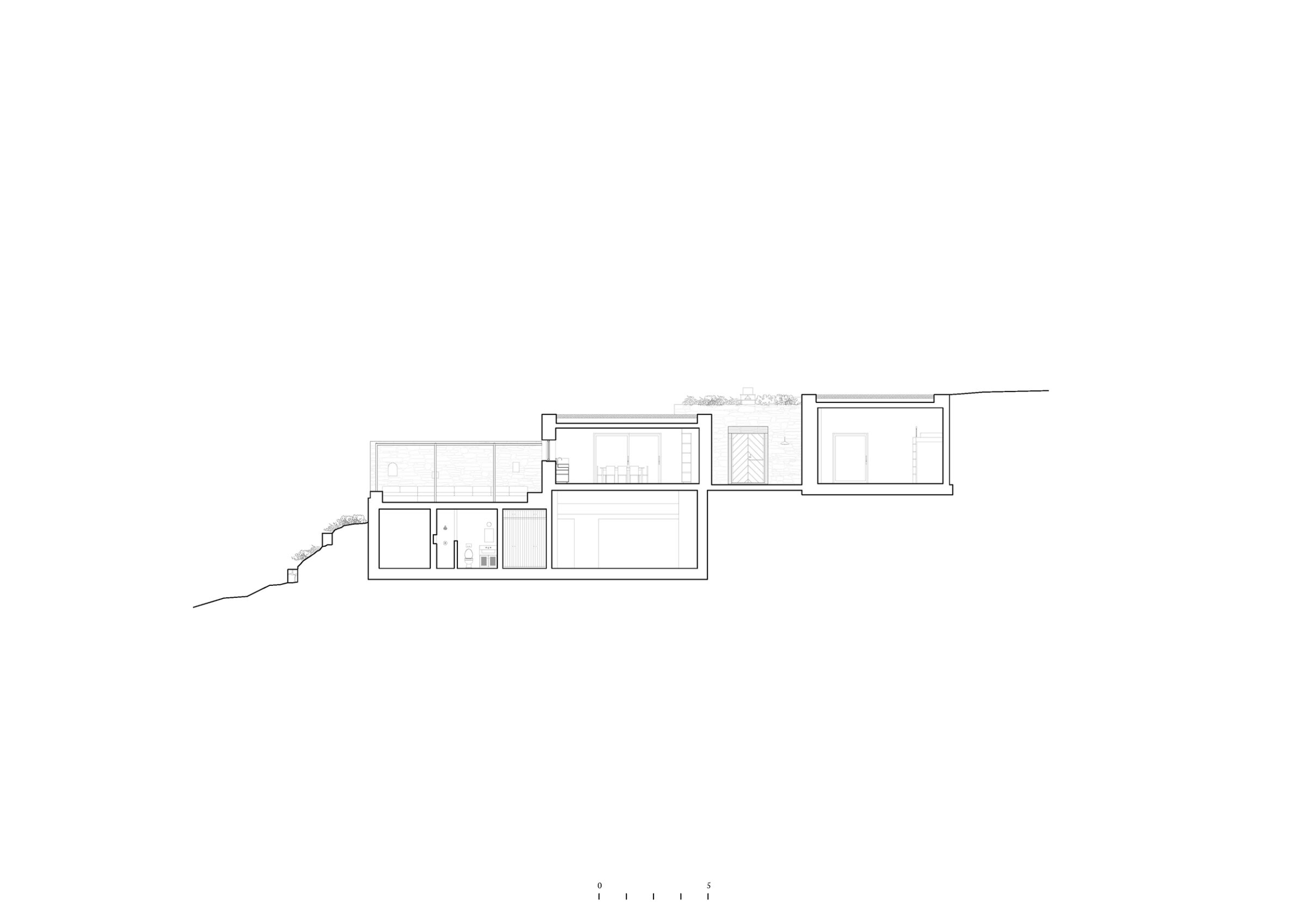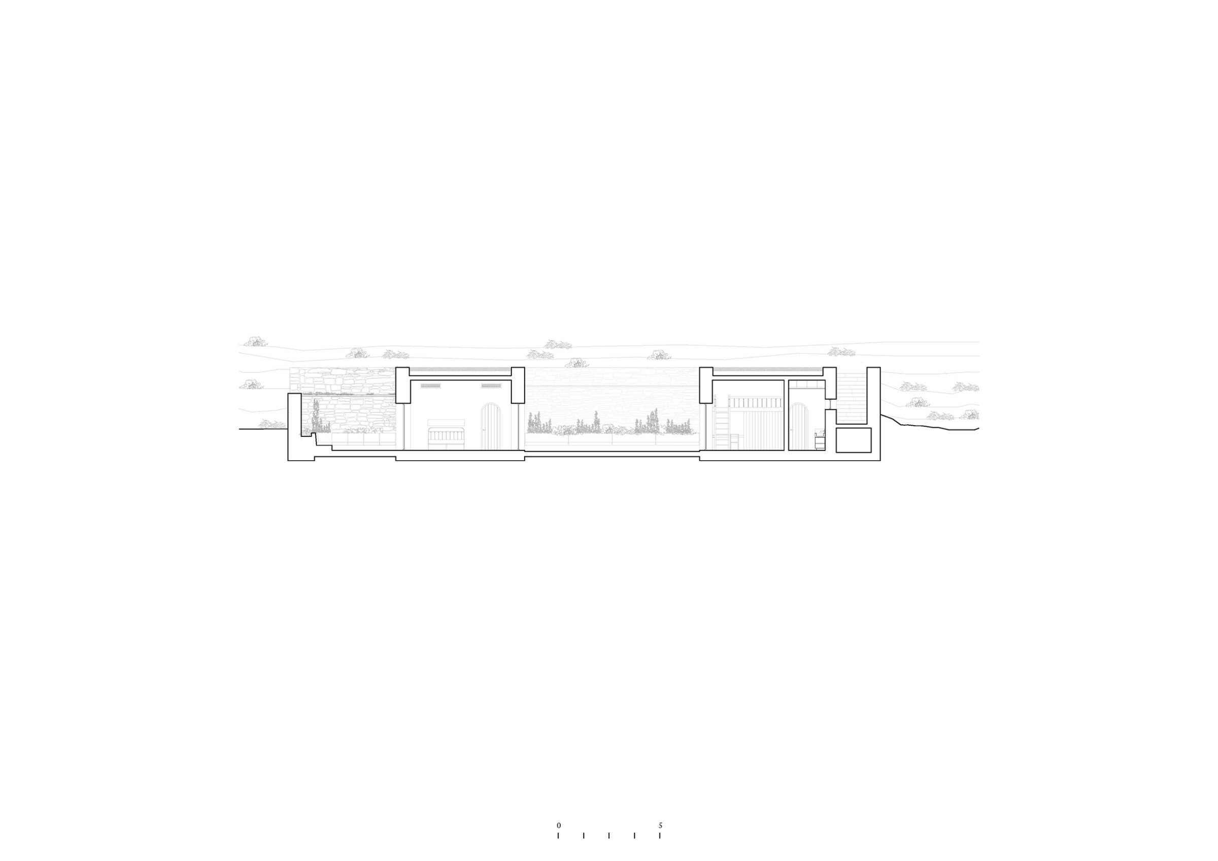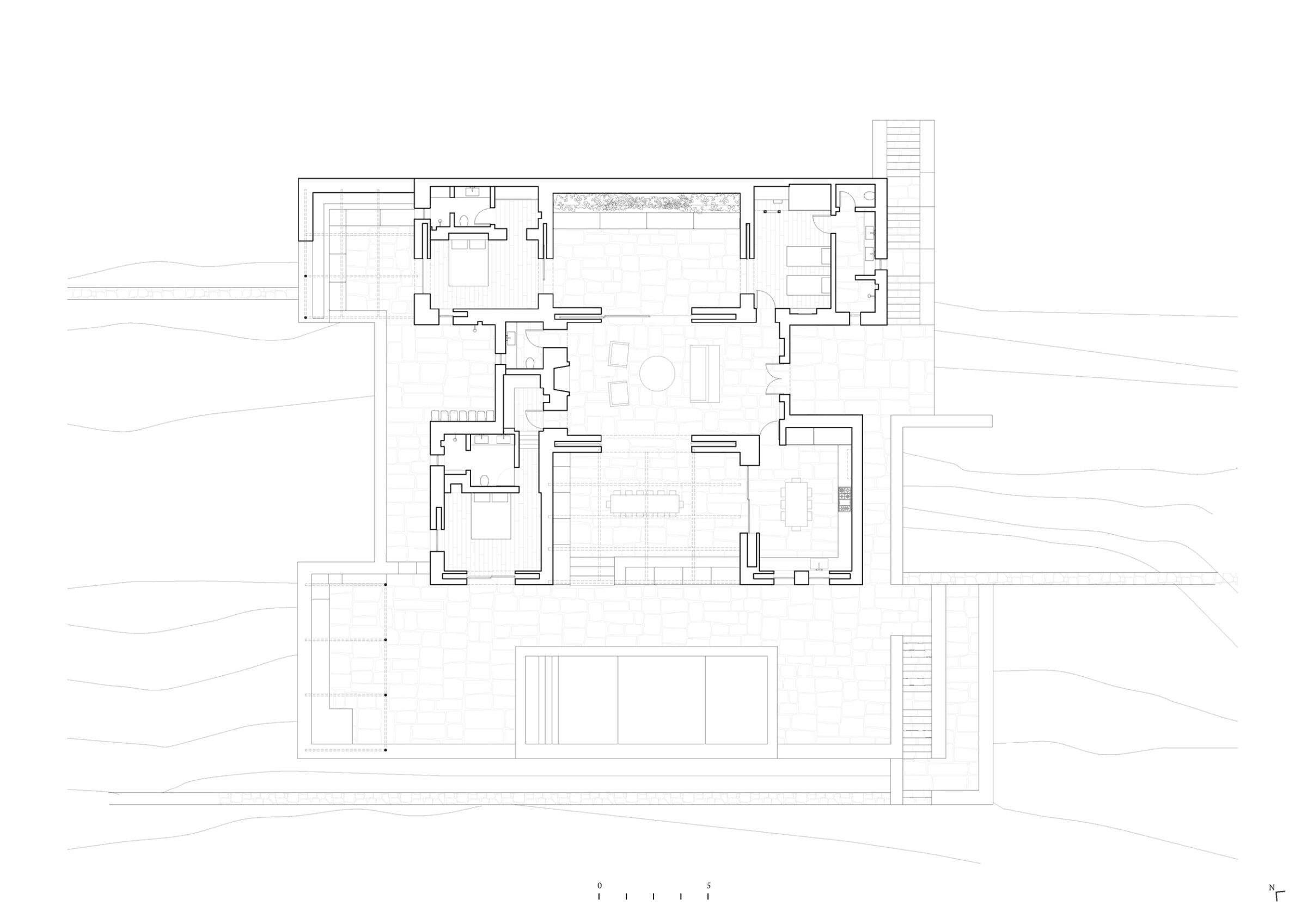 The symmetrical floor plan is reminiscent of a mediaeval castle, with the living room and dining room in the centre, surrounded by three bedrooms and the kitchen at the four corners; the empty spaces between these four ‘bastions’ are transformed into semi-private terraces, where indoor life can spill out in the warmer months. Large openings along the central axis create a cinematic frame for the seascape, bringing it deep into the house and into a walled courtyard, sheltered from the persistent Aegean winds. An additional bedroom is located on the lowest level, with independent access from the garden.