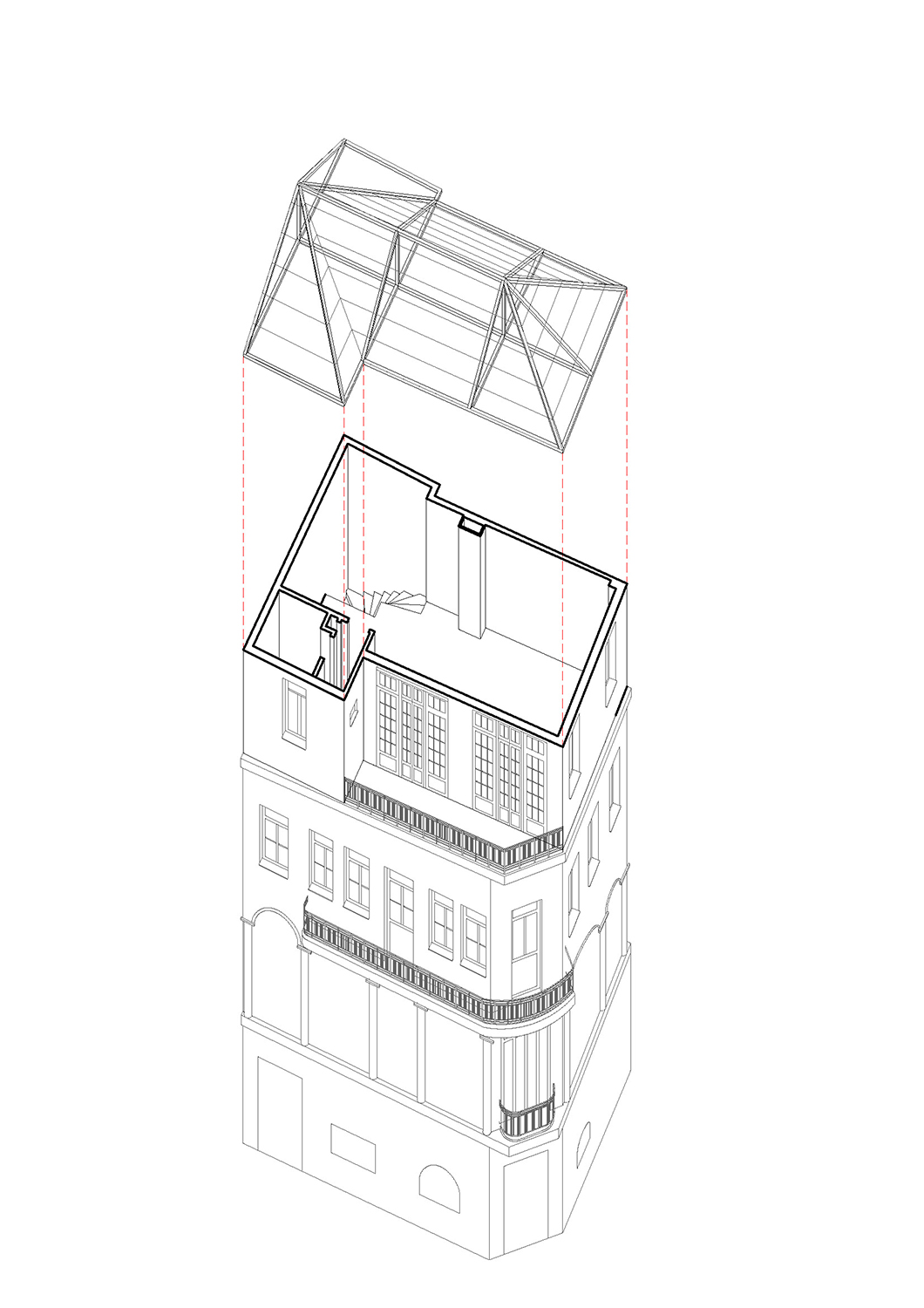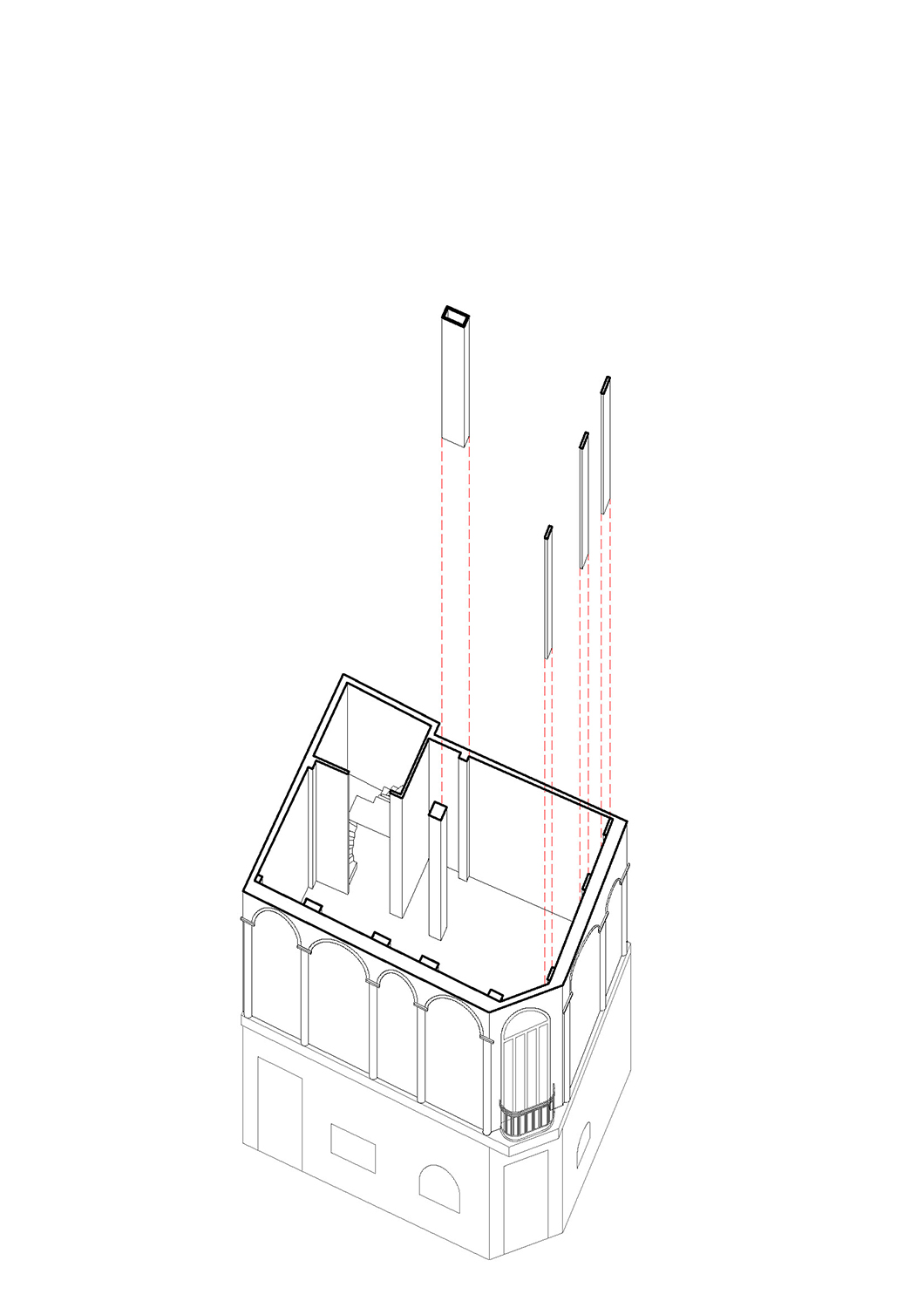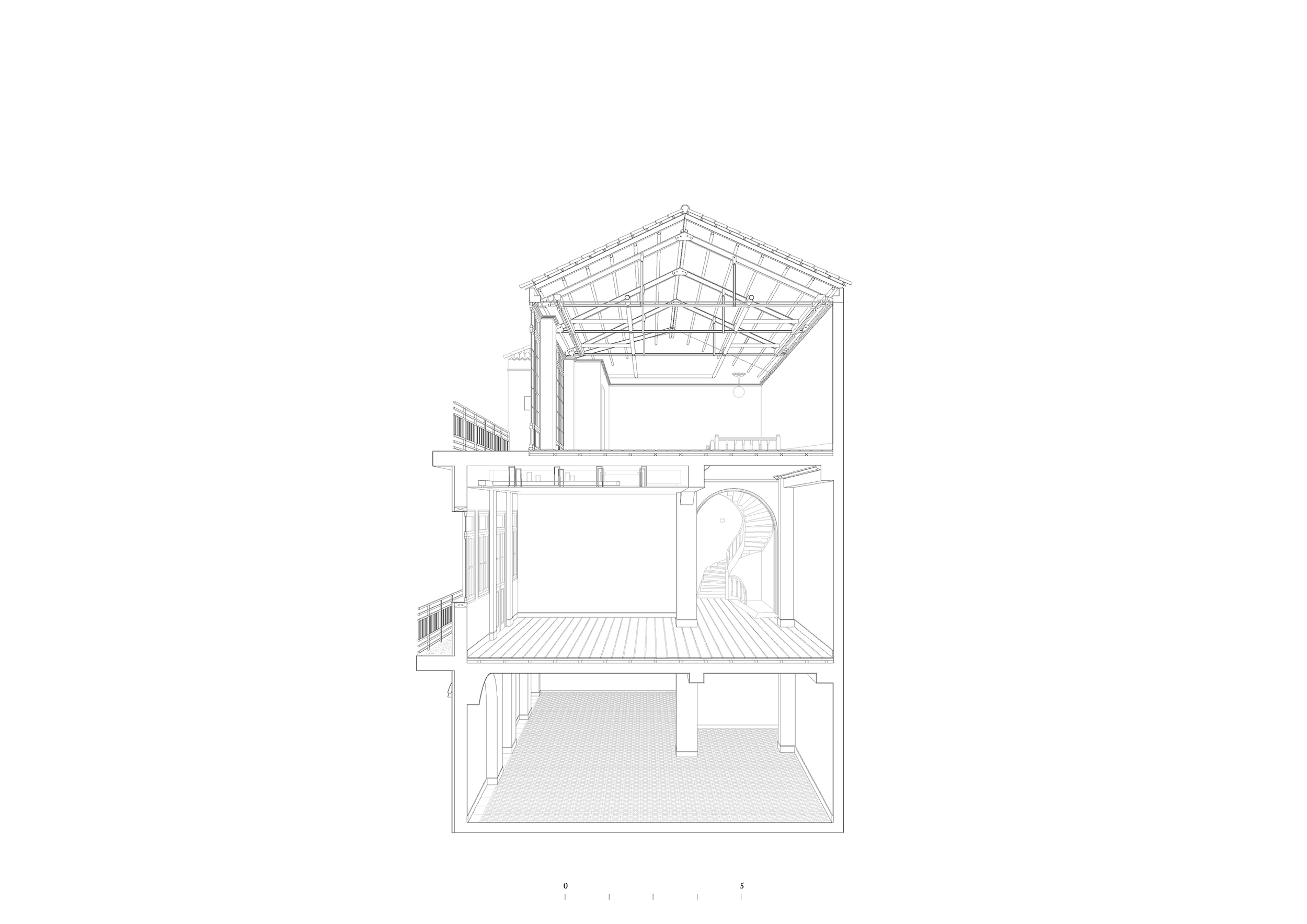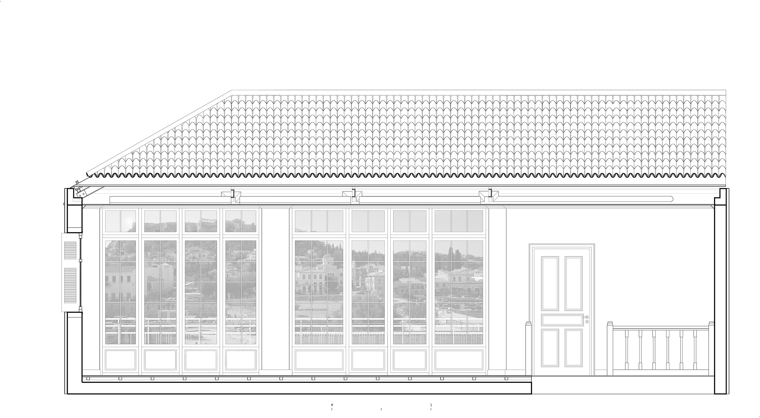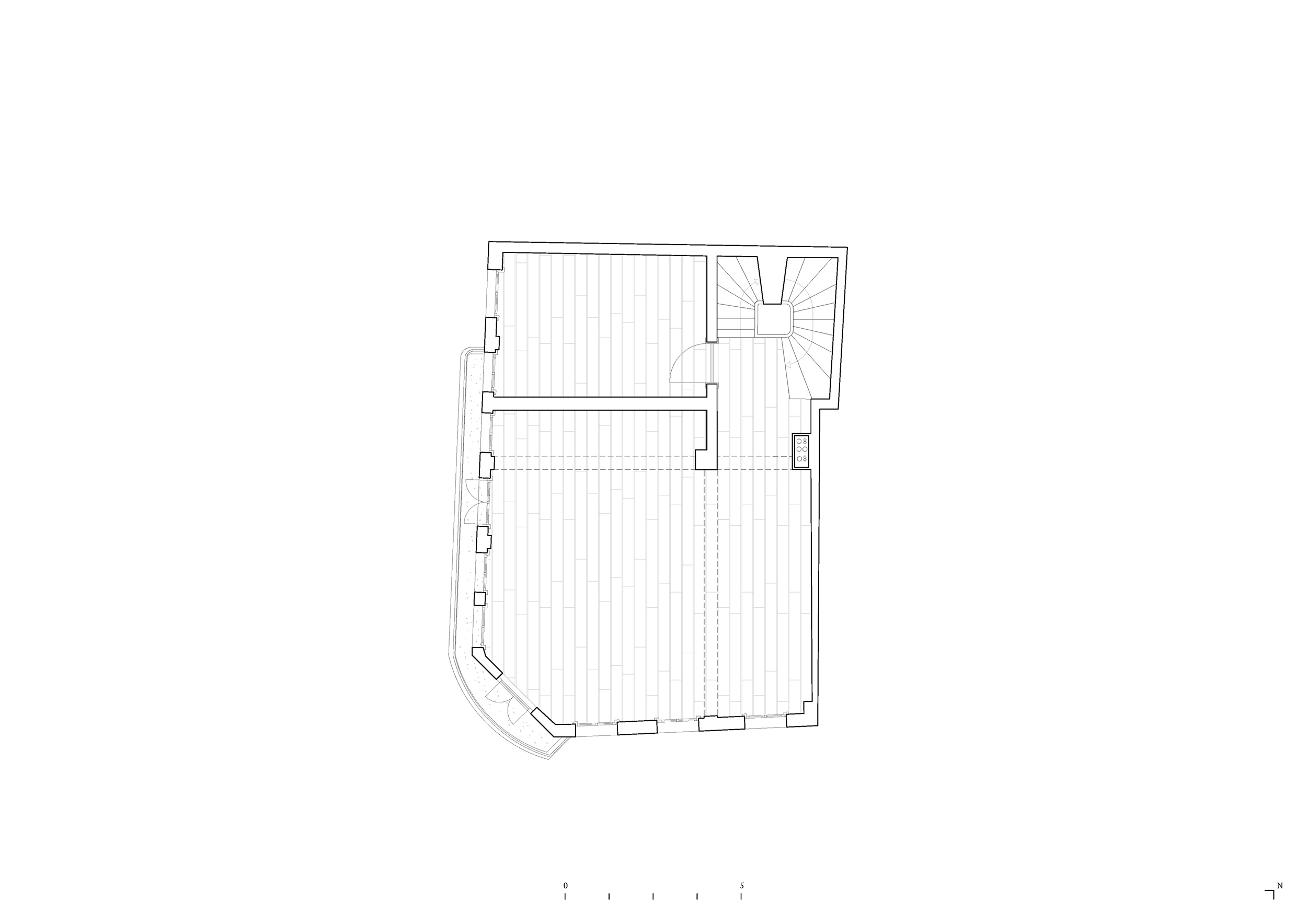 The patchwork of architectural styles and materials seen from the building’s windows was reflected inside as well. Before renovation began, each floor was a palimpsest of surfaces and interventions accumulated over the decades. On the first floor, a series of arches were added to the building in the 1960s by Greek modernist architect Takis Zenetos, while on the second floor, a collage of wood and tile floors was hidden beneath a red carpet. The top floor was a lightweight construction with plain aluminium windows and an asbestos roof.