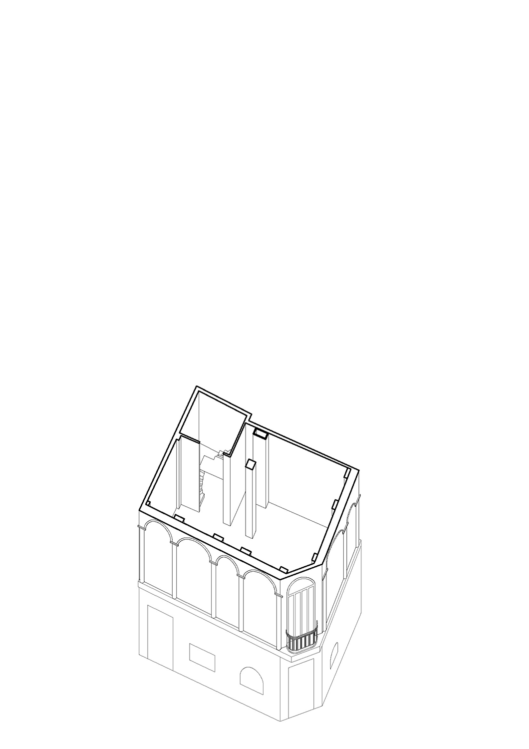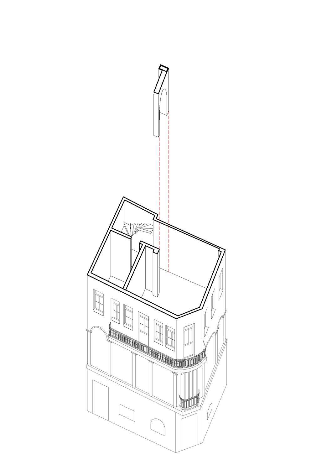 The transformation of the three upper floors of the building was done with respect to the history of the building and its context. Interiors had to be neutral enough for the display of artworks and still retain the elements that make up its identity. Local Local completely demolished and rebuilt the top floor to make way for the ventilation outlets, which were originally located on the first-floor balcony. This made the balcony accessible again, which was given a terrazzo floor with red-coloured binder evoking the traditional tiled roofs of neighbouring buildings. Dividing walls on the second floor were demolished and the floor replaced. The iconic arches of the first floor were respectfully preserved, while all spaces now have integrated ventilation channels that blend in the overall space. The top floor also follows an open plan, in order to create a more versatile and wide space, as well as to better absorb the spectacular view.